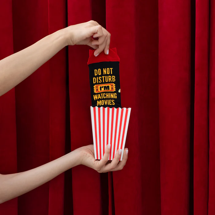 Step into the spotlight! Say hello to your daily dose of drama, now in sock form. These bold “Do Not Disturb, I’m Watching a Movie” socks are here to bring cozy, cinematic vibes to every step. Featuring popcorn tubs, film reels, and playful movie icons, these socks are perfect for a Netflix binge, a cinema date, or just lounging like the star you are. Soft, snug, and made for comfort, they’re your ticket to uninterrupted me-time.