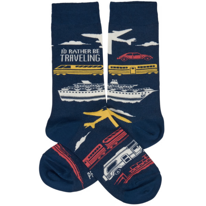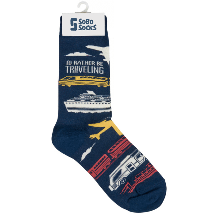 Step into your next adventure! Say hello to your daily dose of wanderlust, now in sock form. These bold “I’d Rather Be Traveling” socks are here to add a playful, adventurous spirit to every step. Featuring planes, trains, and a cruise ship, these socks are perfect for an exciting day out or just dreaming of your next destination. These beauties are soft, strong, and incredibly fun.
